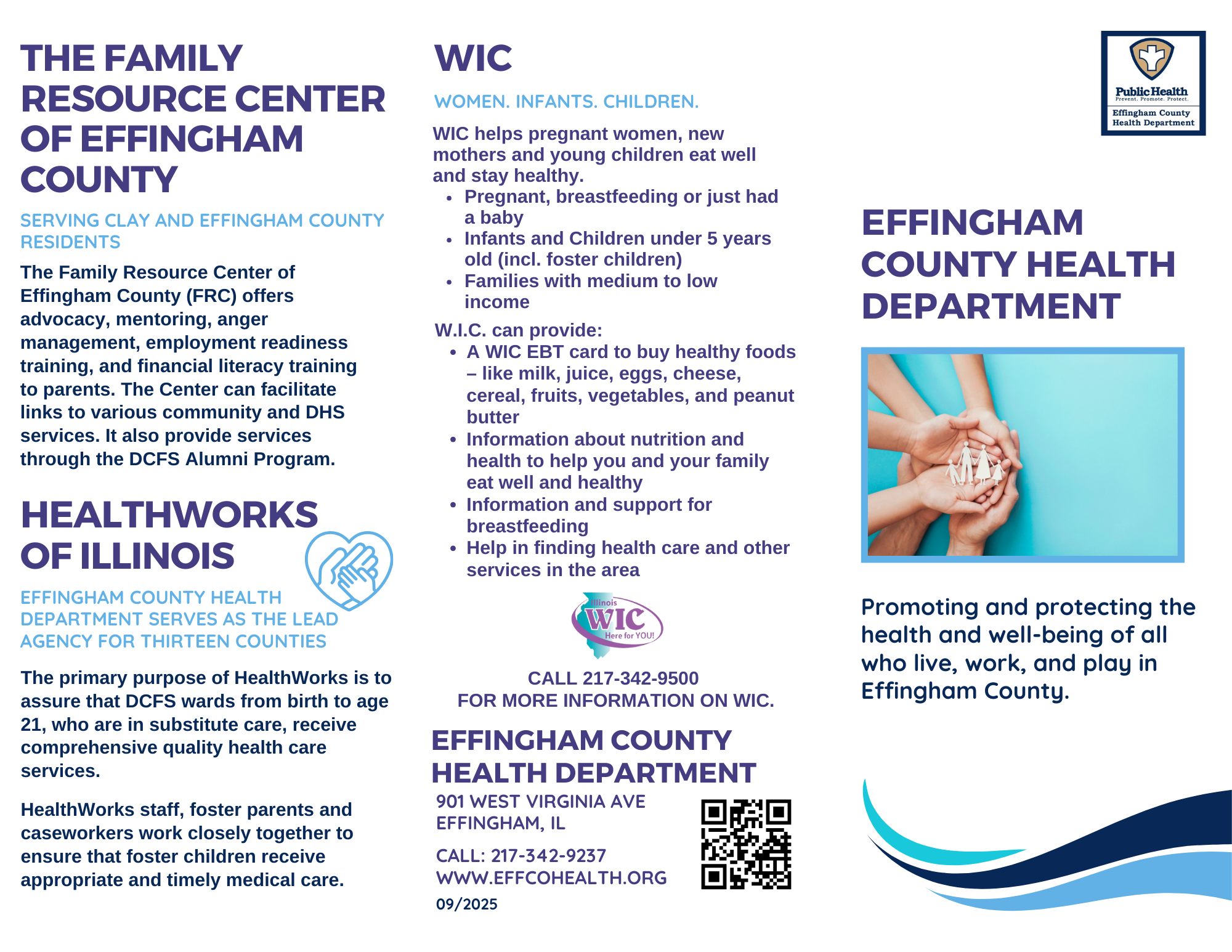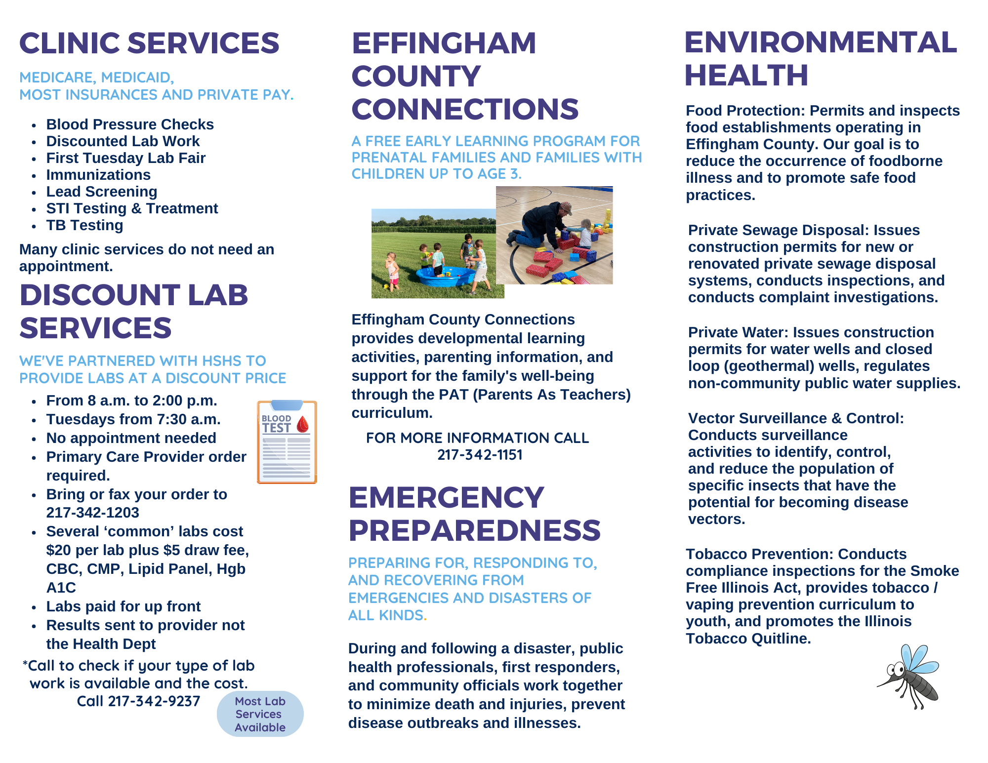 The purpose of the Effingham County Health Department is promoting and protecting the health and well-being of all who live, work, and play in Effingham County.